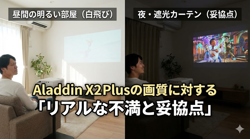 Aladdinの真価が発揮されるのは「夜」です。昼間にどうしても見たい場合は、ニトリなどで買える遮光カーテンを引いて、部屋を暗くする工夫(妥協)が必要になります。