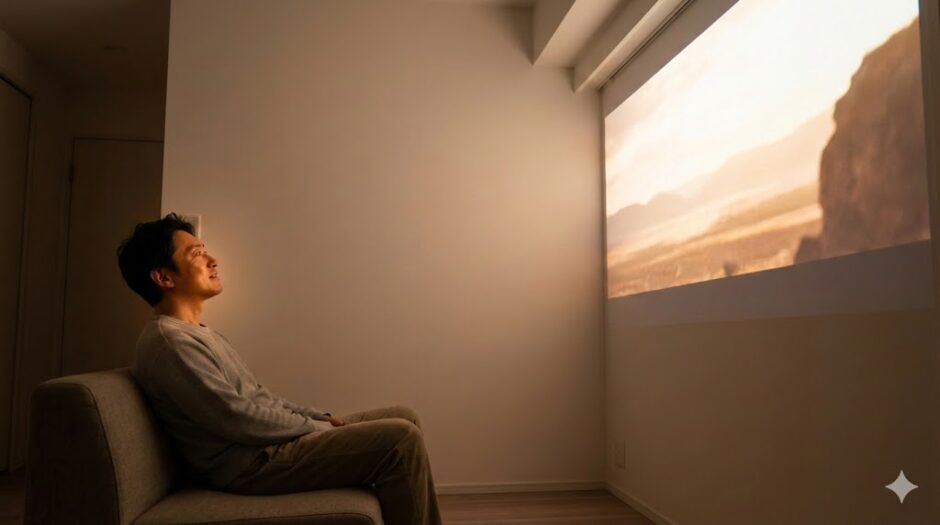 それは、映像の奥に広がりを感じる「圧倒的な没入感」を生み出すためです。テレビのギラギラした映像を「見る」のではなく、壁に映し出された世界に「入り込む」体験。これこそが、数字のスペックでは絶対に測れないプロジェクター最大の価値なのです。