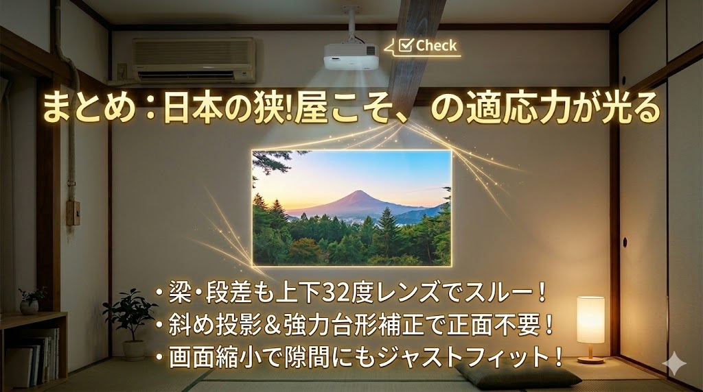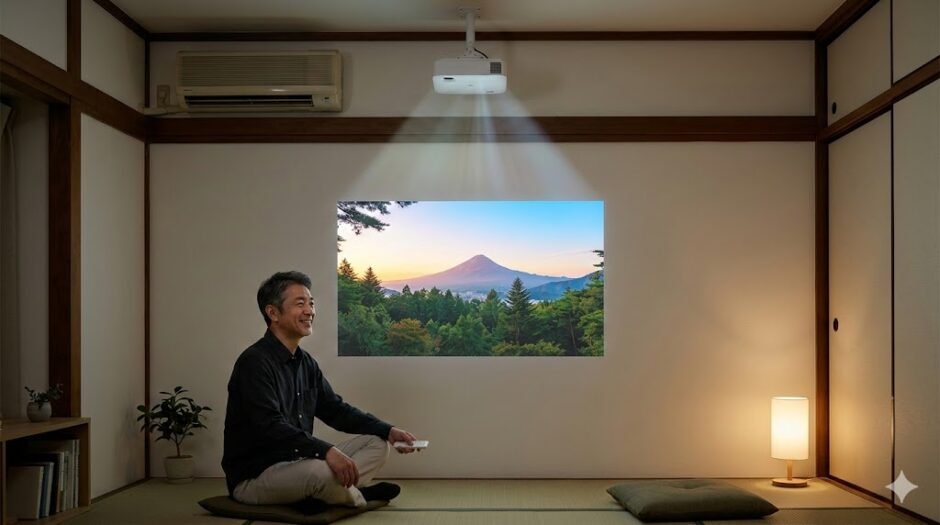 Aladdin X2 Plusは、日本の賃貸住宅特有の「あるあるな障害物」をすべて計算し尽くし、それをデジタルの力で回避できるように進化してきた機材です。 あなたの部屋のちょっとした隙間や、斜めの壁さえあれば、そこはもう立派なプライベートシアターになります。