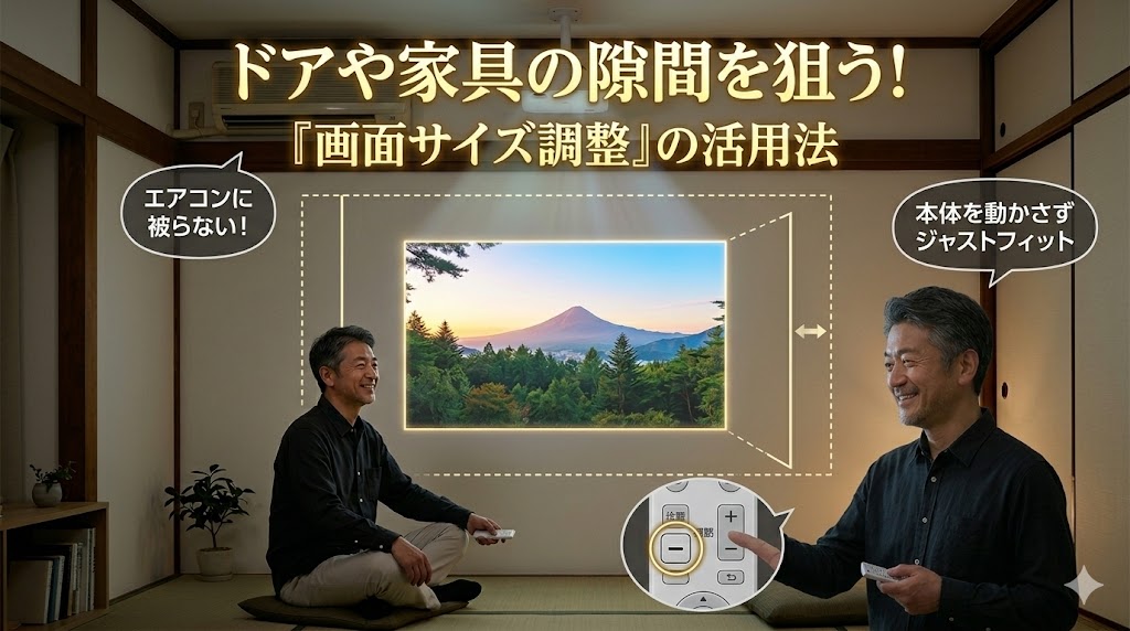 壁までの距離があると、映像は自然と大きくなります。(例:壁まで1.5mで約60インチ) しかし、「60インチで映し出されると、横にあるドア枠やエアコンに少しだけ映像が被ってしまう」というケースがあります。映像の一部が家具に重なるのは、せっかくの没入感を削ぐ不快なノイズですよね。