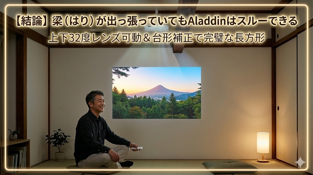 日本のマンションやアパートにお住まいなら、こうした間取りの制約は付き物ですよね。 「せっかく12万円も出してAladdinを買うのに、梁のせいで綺麗に映らなかったらどうしよう」と、購入をためらってしまうお気持ち、とてもよくわかります。