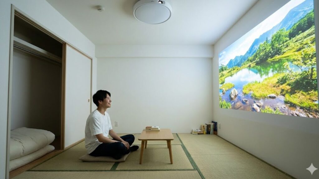 狭い部屋において、プロジェクターを置くための台や、床を這う電源コードは「視覚ノイズ」であり「空間(家賃)の無駄」です。