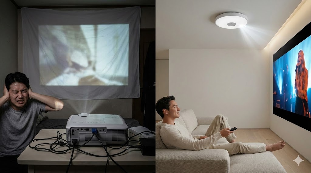 Aladdinは、もともとある天井の照明と入れ替えるだけ。 床のスペースを1ミリも奪わず、使っていない時は真っ白な天井に溶け込んで存在を消します。この「ノイズレスな極上空間」を手に入れるための費用だと考えれば、12万円は決して高くありません。