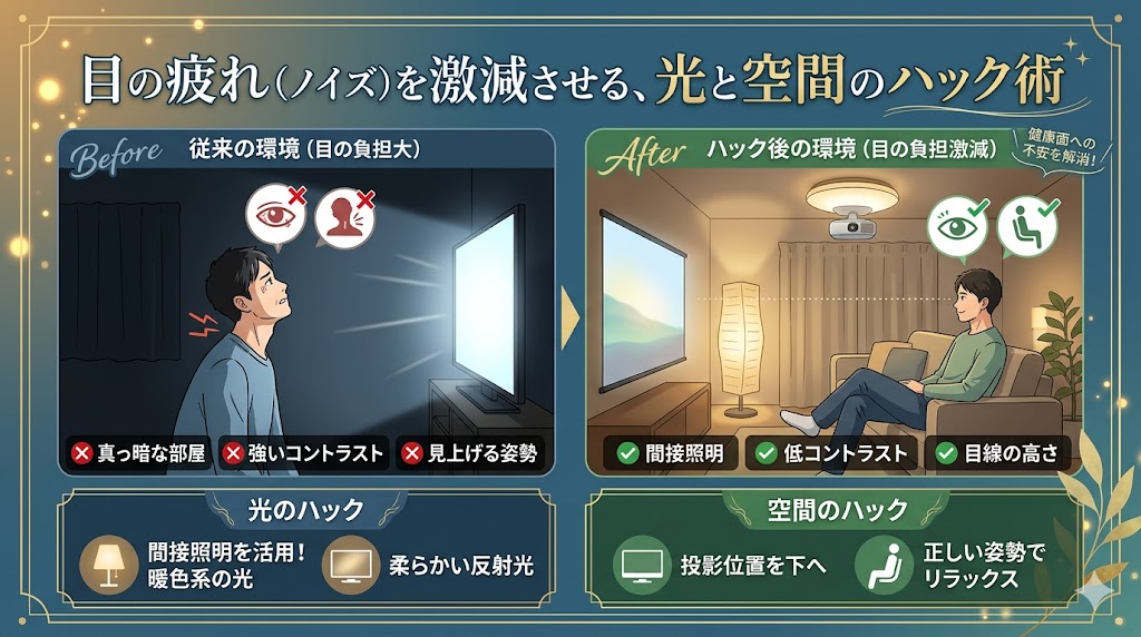 真っ暗な部屋で明るい画面を見続けると、暗い壁と明るい映像の「明暗差(コントラスト)」が強くなりすぎ、瞳孔の開閉が頻繁に起きて目が猛烈に疲れます。部屋の隅に小さな間接照明を置くか、Aladdinの照明機能でうっすらと暖色の明かりをつけておく空間ハックで、視覚的ノイズを和らげてください。