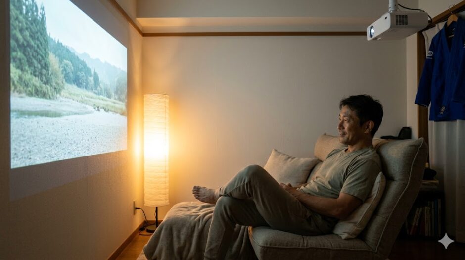 現代人の不調の元凶であるこの悪い姿勢から解放されることこそ、プロジェクター導入の最大のメリットです。 ソファに深くもたれかかり、リラックスした正しい姿勢で大画面を楽しむ。これが身体的ROI(健康への投資対効果)を最大化する、最高のライフスタイルハックなのです。