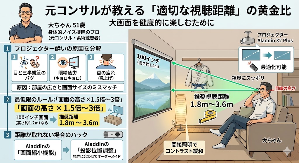 プロジェクター酔いは体質のせいではなく、画面サイズと距離の「ミスマッチ」が引き起こす物理的なエラーです。