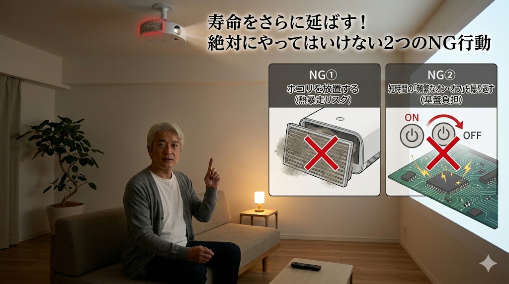 精密機械にとって「熱」は寿命を縮める最大の敵(ノイズ)です。本体上部の吸気口にホコリが溜まると、内部に熱がこもって基盤の劣化を早めます。月に1回、掃除機でフィルターのホコリをサッと吸い取る段取りだけは絶対に忘れないでください。