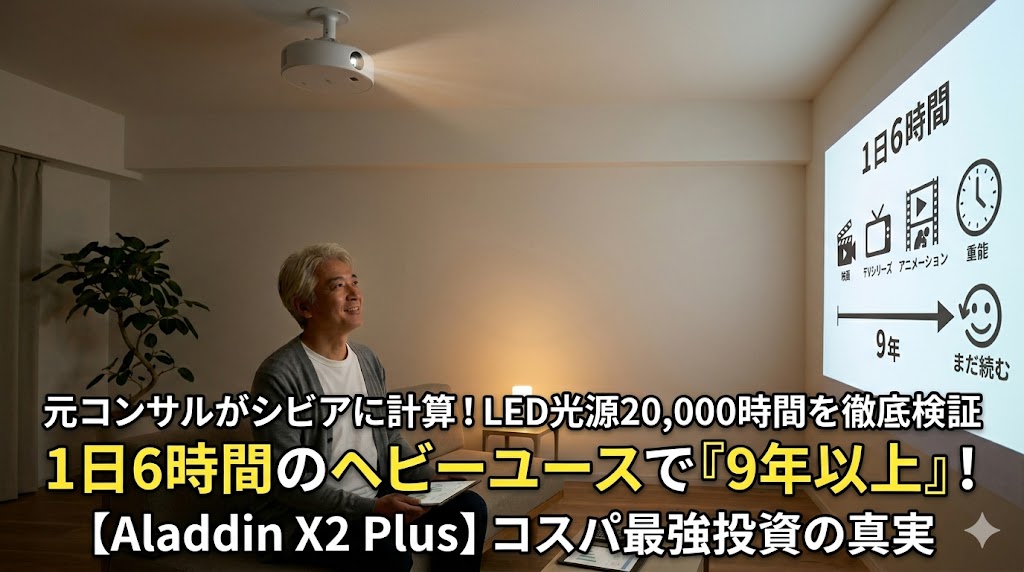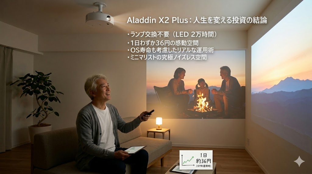 Aladdin X2 Plusは、1日たった36円(5年で買い替えても約65円)という驚異的なコストパフォーマンスで、あなたの部屋を極上のシアターに変え、睡眠の質まで高めてくれる「最高の自己投資」です。