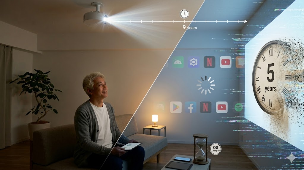 なんと、毎日6時間使い続けても、光源の寿命が来るまでには「9年以上」かかるという圧倒的なファクト(事実)が計算できます。週末に映画を見るだけなら、計算上は数十年持つことになります。