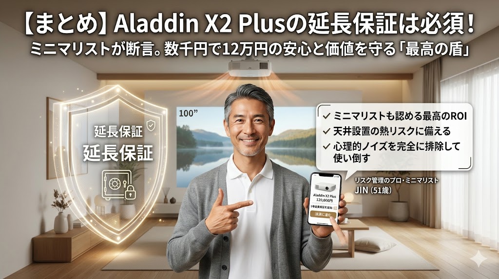「自分が、この先の数年間、一切の不安を感じずに100インチの大画面を満喫するためだけの保険」。そう割り切って、自分の生活の質を守るために追加費用を支払うのが、大人の正しい自己投資の考え方です。