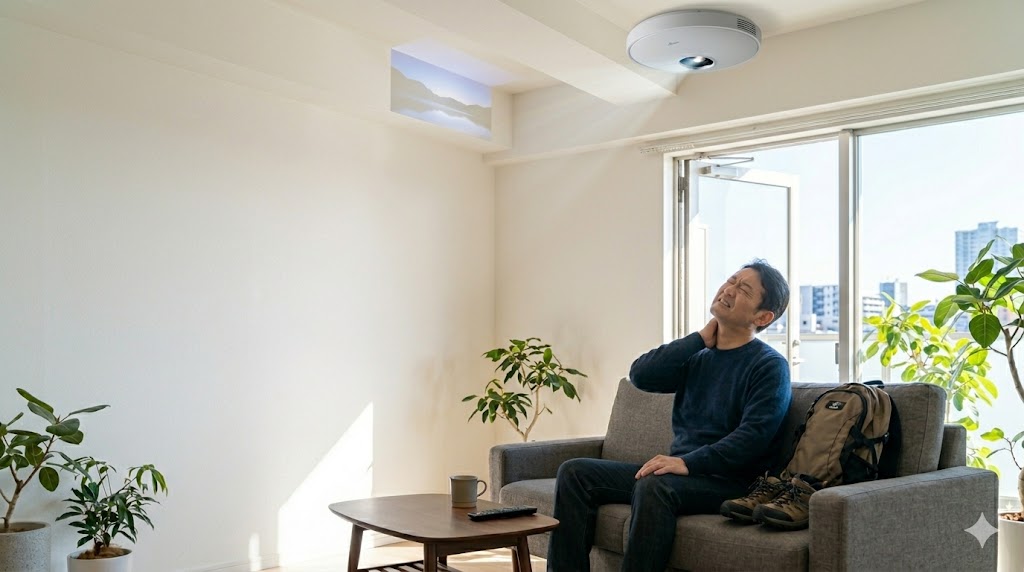 これは完全にユーザー側の「事前の段取り(リサーチ)不足」です。 プロジェクターの画面サイズは、天井の引掛シーリング(取り付け位置)から壁までの「距離」で物理的に決まります。メジャーでたった1回距離を測る労力を惜しんだ結果、「こんなはずじゃなかった」と嘆くのは、製品のせいではありません。