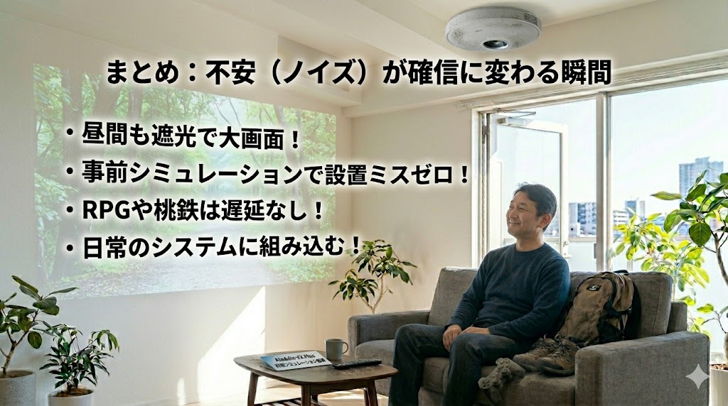 むしろ、100インチの大画面でみんなでプレイする圧倒的な楽しさが、無線のデメリットを大きく上回ります。「自分がどんなゲームをやるのか」を冷静に見極めれば、後悔することはありません。