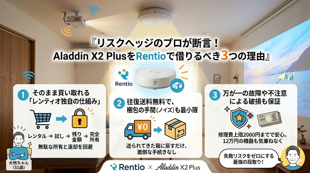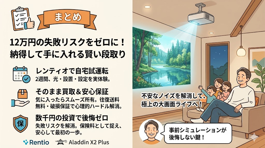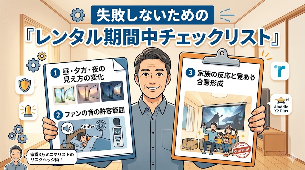 万が一、部屋の梁(はり)が邪魔で設置できなかったり、画面の大きさが体質に合わずに酔ってしまったりした場合、いきなり新品を買っていれば12万円をドブに捨てることになります。その最悪のリスクを回避するための「安全への投資(保険料)」と考えれば、レンタルは極めて賢い段取りと言えます。