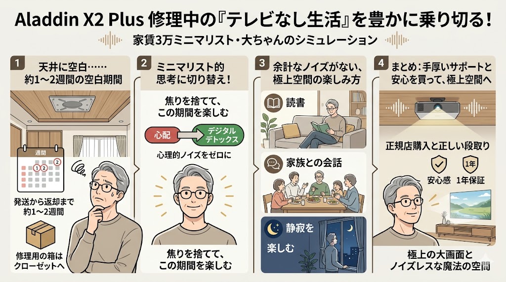 修理に出している数週間は、「スマホや大画面から離れて、読書をしたり、家族との会話をゆっくり楽しんだりするデジタルデトックスの期間」だとポジティブに捉えてみてください。部屋に余計なノイズがない、ミニマリストの静かな夜を楽しむ。そう割り切るだけで、修理期間中のストレスは完全にゼロになります。