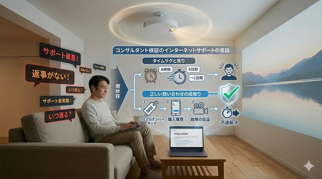 Aladdinのカスタマーサポートは、電話ではなく「メール(またはお問い合わせフォーム)」でのやり取りが基本となります。 機械が動かなくなって「今すぐ直してほしい!映画が見たいのに!」と焦っているユーザーにとって、メールを送ってから返信が来るまでの数時間〜数日のタイムラグは、猛烈なストレスになります。
