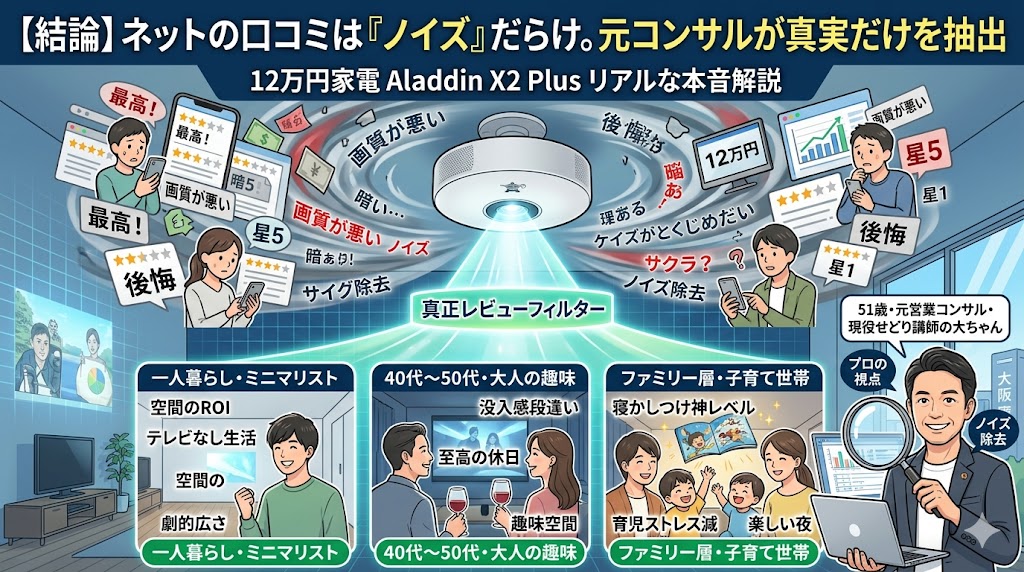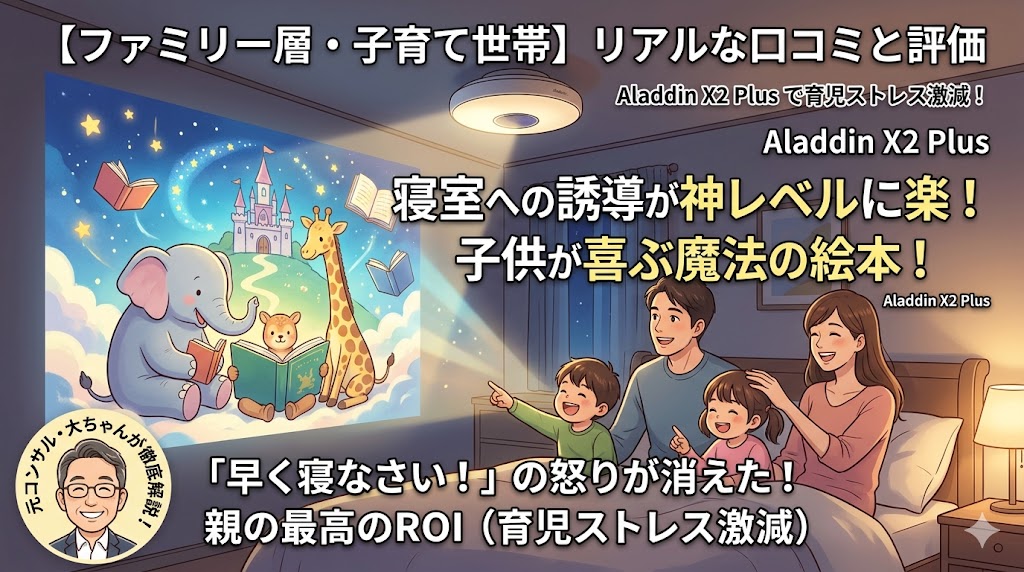 しかし、コンサル視点で言えばこれは「お門違い」です。Aladdinはあくまで「配線不要で誰でも簡単に大画面を楽しめる、照明一体型のオールインワン家電」です。何十万円もする専用機と比べるのは、ターゲット層(求める価値)がズレています。