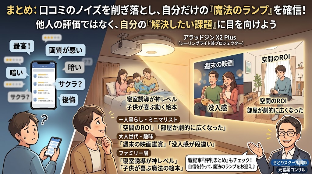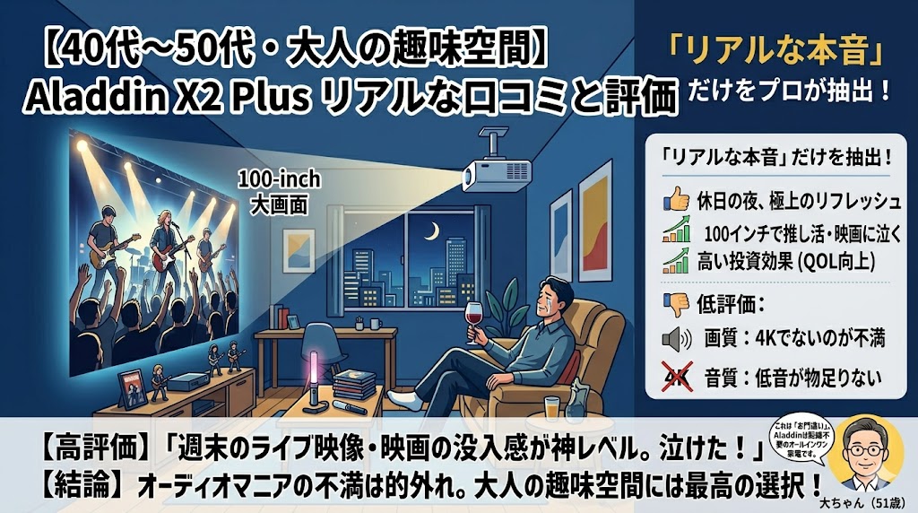 大切なのは、あなたが「テレビ台をなくして部屋を広くしたいのか」「週末に極上の映画空間が欲しいのか」「子どもの寝かしつけを楽にしたいのか」という、自分の目的(解決したい課題)です。 自分の求める段取りさえ明確であれば、Aladdin X2 Plusは絶対に後悔しない、最高の選択になります。