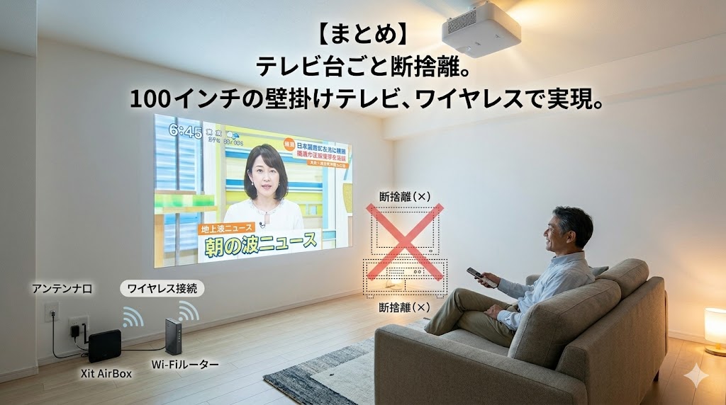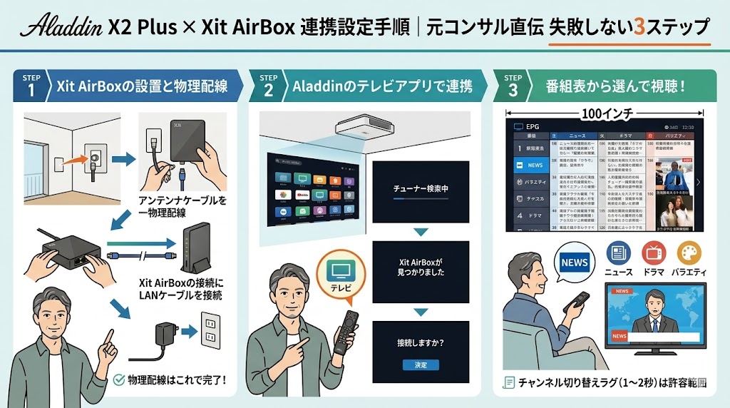 公式推奨のテレビチューナー『Xit AirBox(サイト エアーボックス)』を部屋の隅に置くだけで、あなたのAladdinが「100インチの壁掛けテレビ」に進化します。天井からケーブルを垂らす必要も一切ありません。