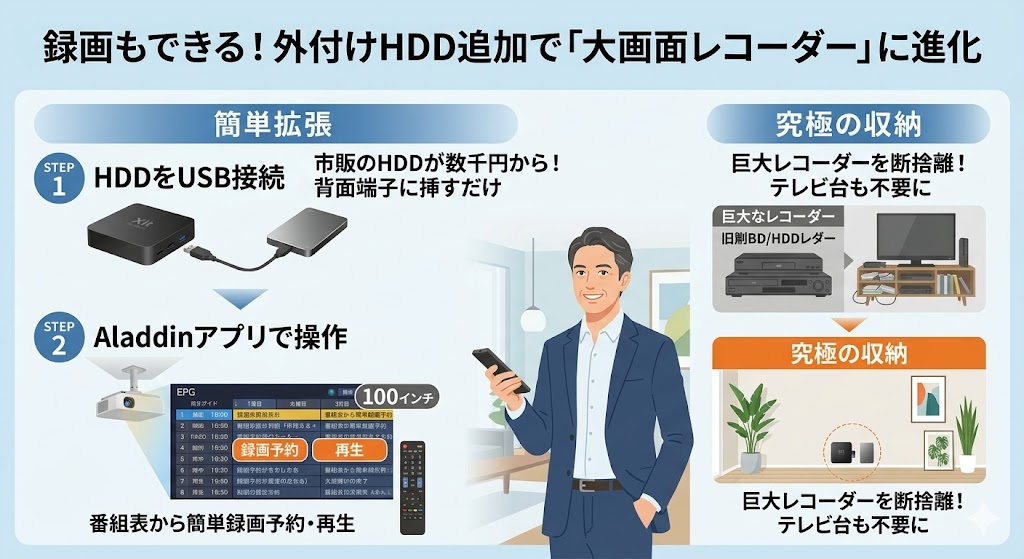 ここに、Amazon等で数千円で買える市販の「外付けHDD(ハードディスク)」をケーブルで繋ぐだけです。 たったこれだけの追加投資で、Aladdinのテレビアプリから直接番組表を開き、リモコン一つで番組の録画予約や、録画した番組の再生ができるようになります。