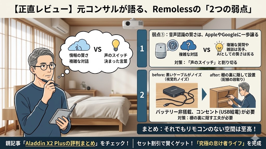 一方、RemolessはAladdin専用に作られているため、直接「アラジン、〇〇して」と話しかけるだけで瞬時に反応します。 この「コンマ数秒のレスポンスの差」と「言葉の短さ」こそが、毎日使うデバイスにおいて最も重要な費用対効果(ROI)です。言葉が長いというストレスを排除するためだけにでも、専用機を選ぶ価値は十分にあります。