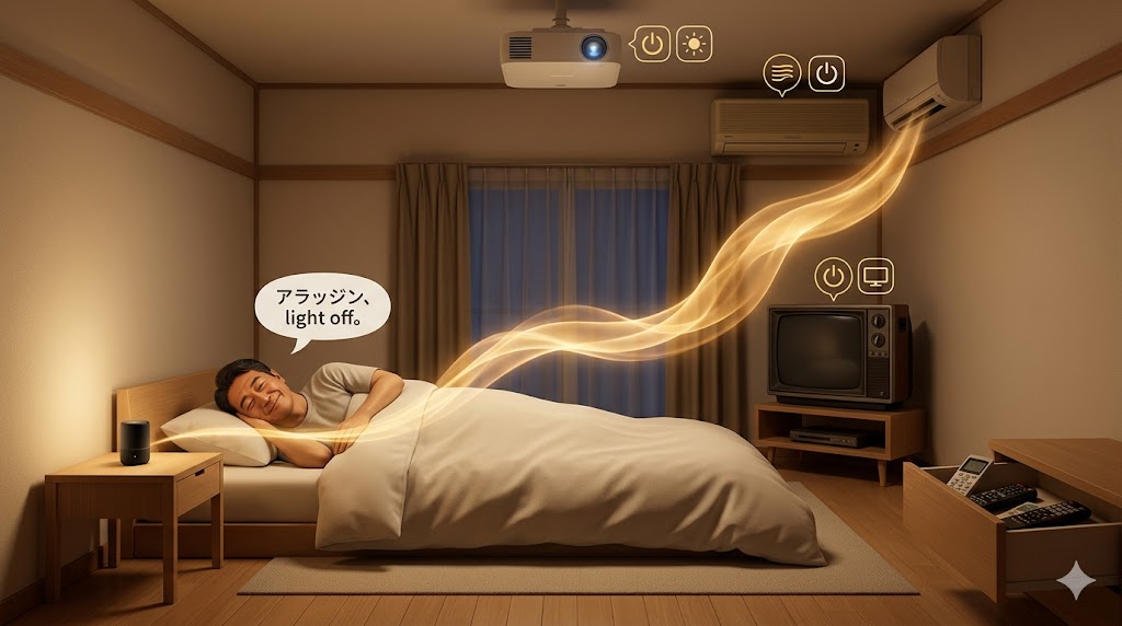 布団の中から「アラジン、電気消して」と声を発するだけ。たった1秒で部屋が真っ暗になります。この「自分の体が1ミリも動かなくていい」という圧倒的なQOL(生活の質)の向上は、一度味わうと絶対に抜け出せなくなります。