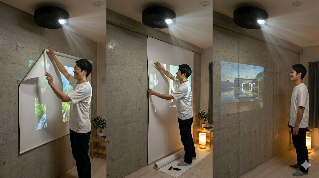 DIYに抵抗がない方なら、現在の壁紙の上から貼れる「はがせるプロジェクター用壁紙」を使うのも手です。 数千円で真っ白で平滑な壁が手に入り、退去時にはペリッと綺麗にはがせるため、原状回復の心配もありません。