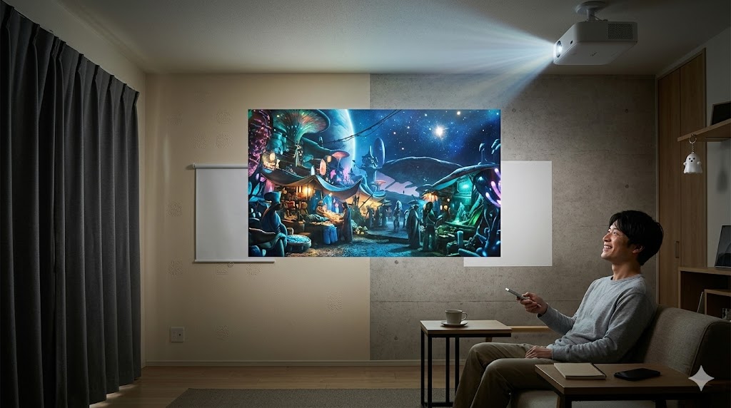 せっかく12万円も出してプロジェクターを買うのに、「うちの壁の色や素材のせいで、綺麗に映らなかったらどうしよう」と不安になるお気持ち、よくわかります。映画館のような完璧な真っ白の壁があるお部屋なんて、そうそうありませんよね。