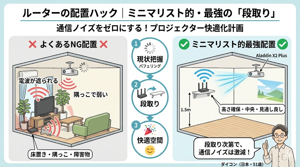 ミニマリスト的・最強の通信ハックは、「見通しの良い空間を作ること」です。 ルーターは床から1〜2mほどの高さ(棚の上など)に配置し、天井にあるAladdinとの間に、電波を遮る大きな家具や金属製の物を置かないようにしてください。この物理的な段取りを整えるだけで、電波の強度は劇的に回復します。