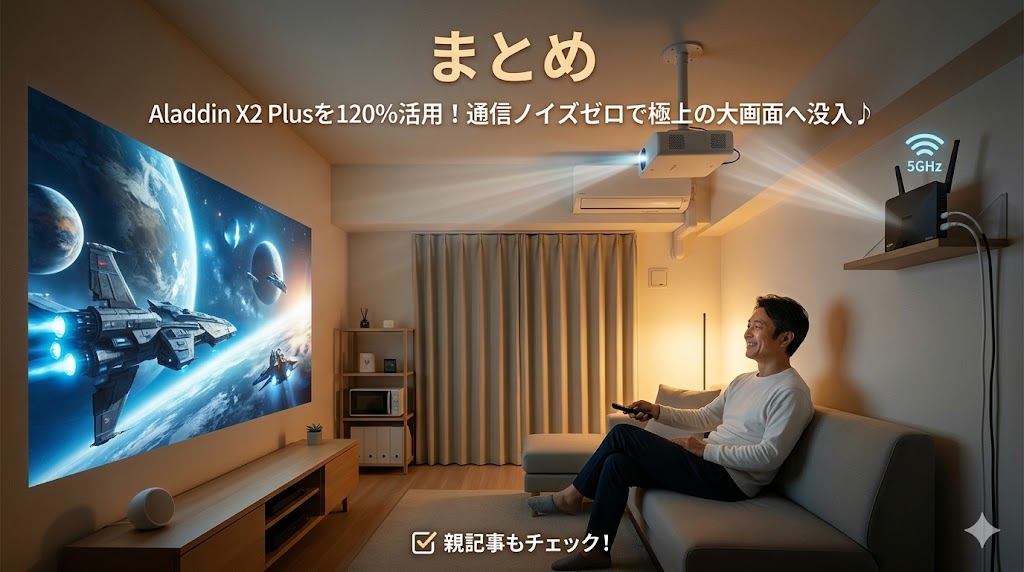 せっかくの100インチ大画面も、通信ラグという「ノイズ」が入った瞬間に没入感は完全に削がれてしまいます。Wi-Fi環境は、Aladdin X2 Plusの生命線とも言える最重要インフラです。